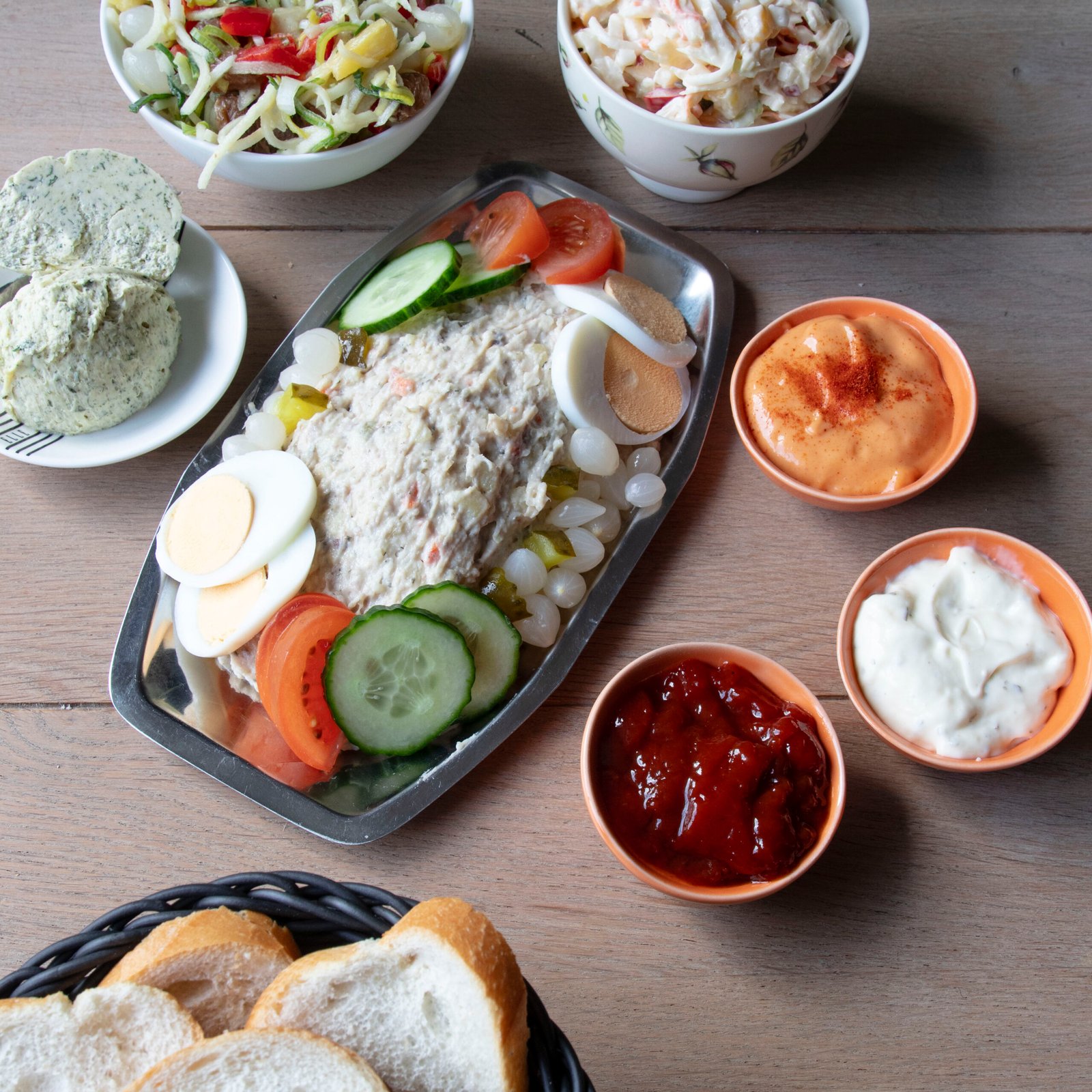 Inclusief garnituren: rundvleessalade, 2 soorten rauwkost, 3 soorten saus, stokbrood en kruidenboter.