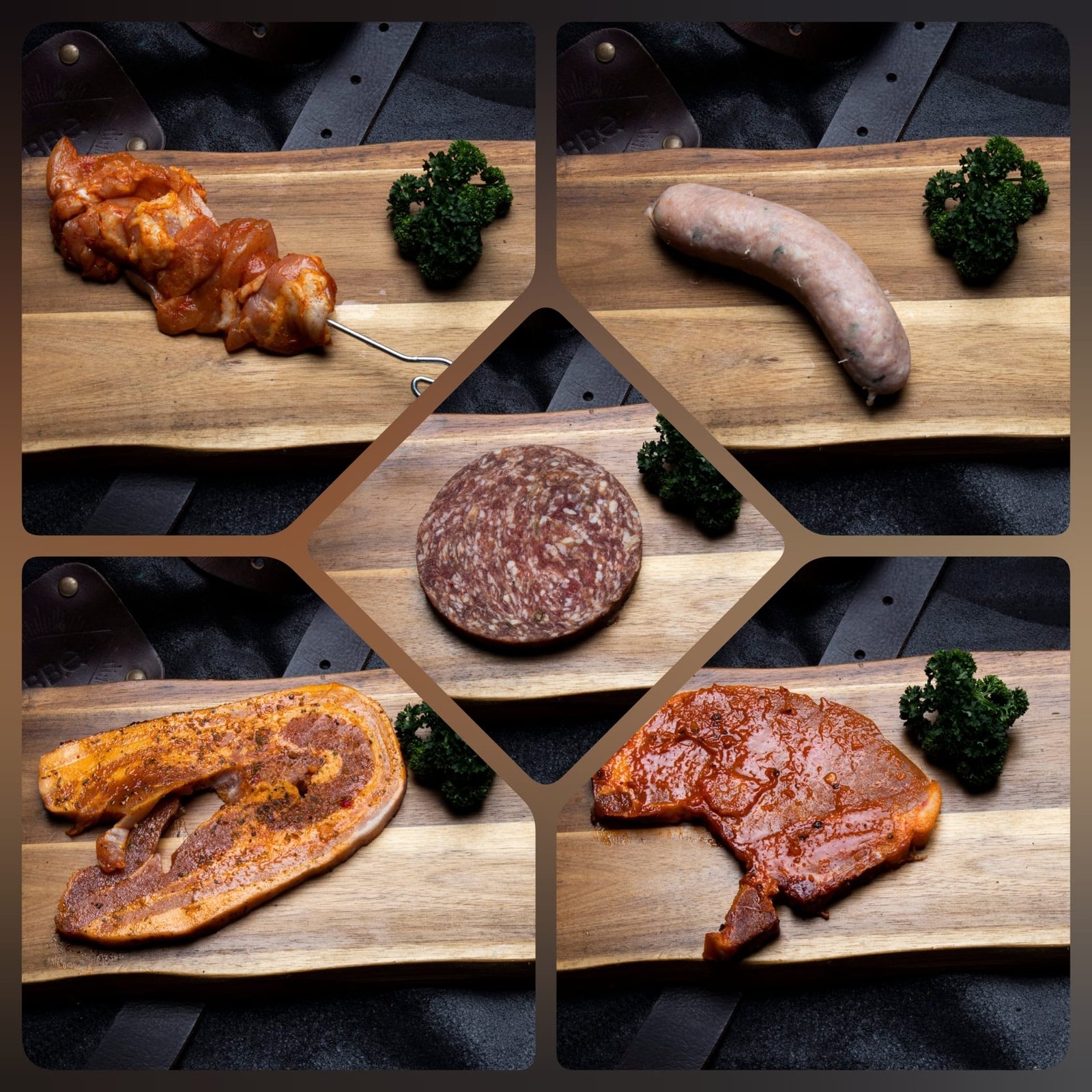 Pakket bestaande uit 1 hamburger, 1 barbecueworst, 1 speklap, 1 karbonade, 1 kipdijfiletspies.